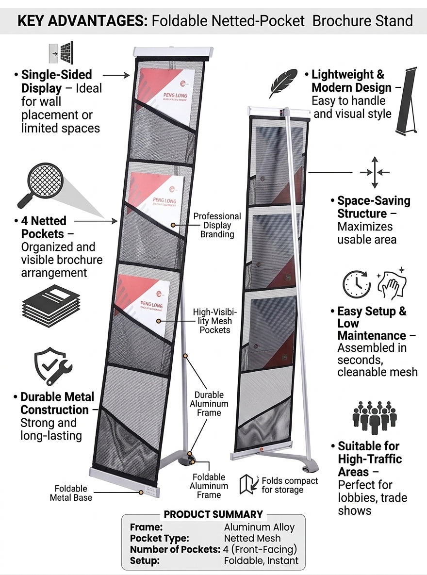 Present your brochures in a clean and professional way with the Netted Brochure Stand – Single Sided with 4 Pockets — durable, practical, and space-efficient — exclusively from Sign & Display UAE.